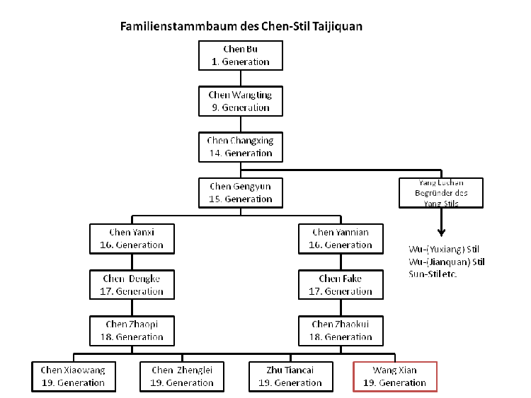 Als Ursprung des Taijiquan gilt die Familie Chen, deren Basis immer noch das kleine Dorf Chenjiagou in der Provinz Henan ist. Bereits Urahn Chen Bu (1. Generation , 14. Jahrhundert) soll Kampfkünste praktiziert und in der Familie tradiert haben. Als offizieller Begründer des Taijiquan gilt jedoch sein Nachfahre der 9. Generation, Chen Wangting (1600 – 1680), welcher nach dem Niedergang der Ming-Dynastie (1368 – 1644) in sein Heimatdorf zurückkehrte und sich fortan dem Studium der Kamfpkünste widmete. Dabei entstand ein Kampfkunstsystem, welches nebst anderen Formen unter anderem eine Langform mit 108 Bewegungen, eine Kanonenfaust-Form (Paochui), Tuishou und mehrere Waffenformen beinhaltete. Weiter stützte er sich bei der Entwicklung seiner Kampfkunst auf die daoistische Philosophie und auf das Huangdi Neijing, welches als die fundamentale Quelle für die traditionelle chinesische Medizin gilt. Abkömmlinge der 14. Generation reformierten den Stil und unterteilten ihn in die heute bekannten Richtungen Lao Jia und Xiao Jia (früher Xin Jia). Chen Changxing, dessen Schüler Yang Luchan den heute am meisten verbreiteten Yang-Stil begründete, schuf den alten Rahmen mit den Faustformen Lao Jia Yi Lu (75 Bewegungen) und Lao Jia Er Lu (43 Bewegungen), welcher durch Chen Zhaopi und den vier Wächtern Buddhas bis in die heutige Zeit tradiert worden ist. Heute lehrt Wang Xian in 19. Generation dieses ursprüngliche Taiji-System in Chenjiagou und vielen Ländern in Asien, Europa und Nordamerika. In der 1. Hälfte des 20. Jahrhunderts entwickelte zu dem Chen Fake, 17. Generation den so genannten neuen Rahmen des Chen-Stils (Xin Jia). Diesen gab er an seinen Sohn Chen Zhaokui weiter, der ihn wiederum an Wang Xian weitergab.